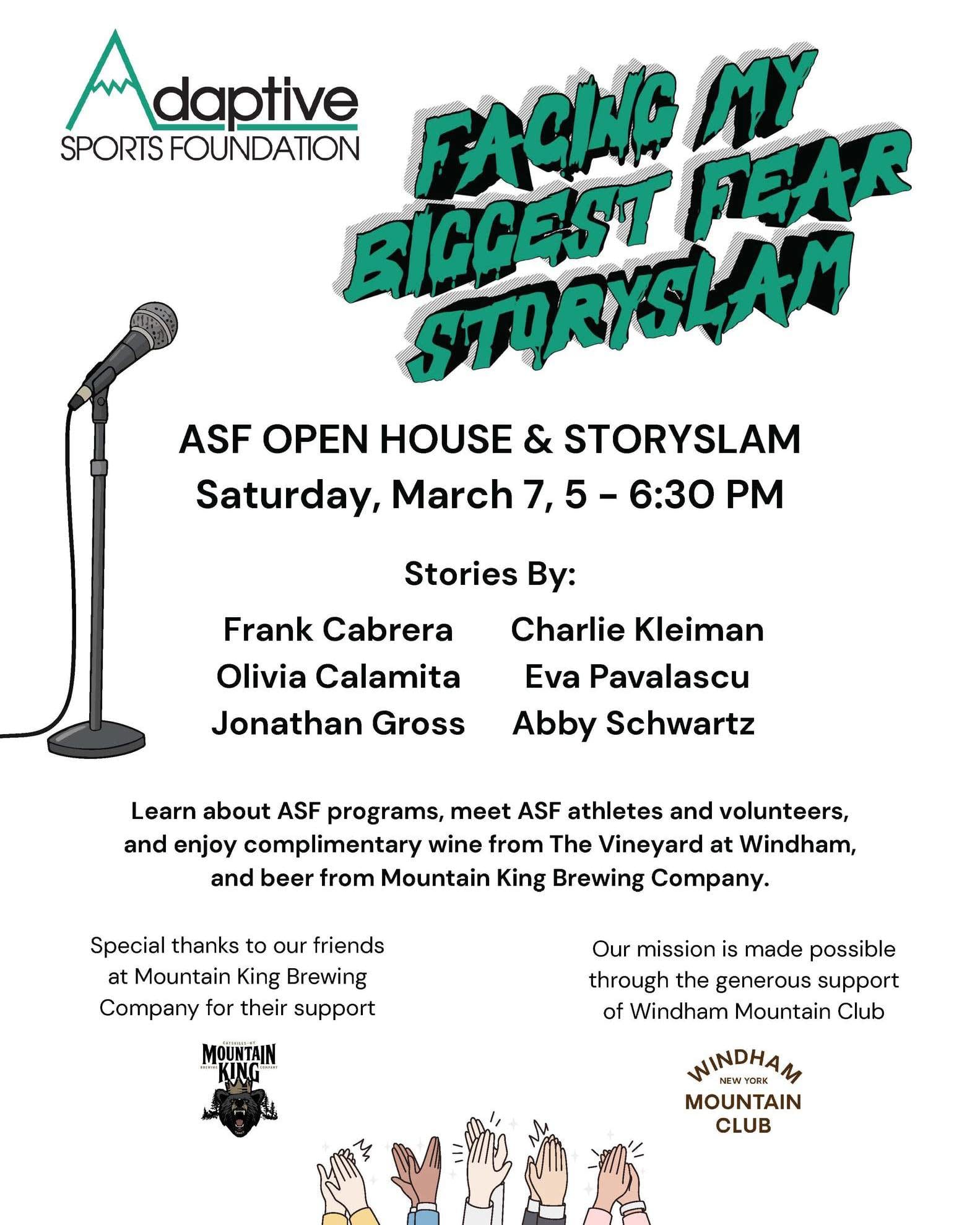 Join us for our first-ever ASF Community StorySlam, an evening of connection and storytelling. While enjoying local wines and brews from The Vineyard at Windham and Mountain King Brewing Company, you’ll hear powerful, personal stories from six individuals – Frank Cabrera, Olivia Calamita, Jonathan Gross, Charlie Kleiman, Eva Pavalascu, and Abby Schwartz – about vulnerability, resilience, and what it takes to face your biggest fear. RSVP Here: https://adaptivesportsfoundation.wufoo.com/forms/r33eztw1356sa9/