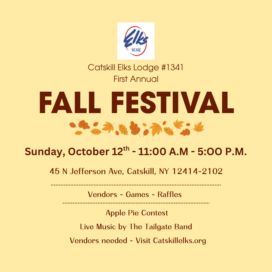 The Catskill Elks #1341 is sponsoring a Fall festival, a charitable fundraising event to support community-focused initiatives. Admission is $5.00 per person (14 and under Free) The festival will feature: Live music, Vendors, Food, Games, Raffles and an apple pie contest. This event is rain or shine, and attendees are encouraged to bring a lawn chair.Images