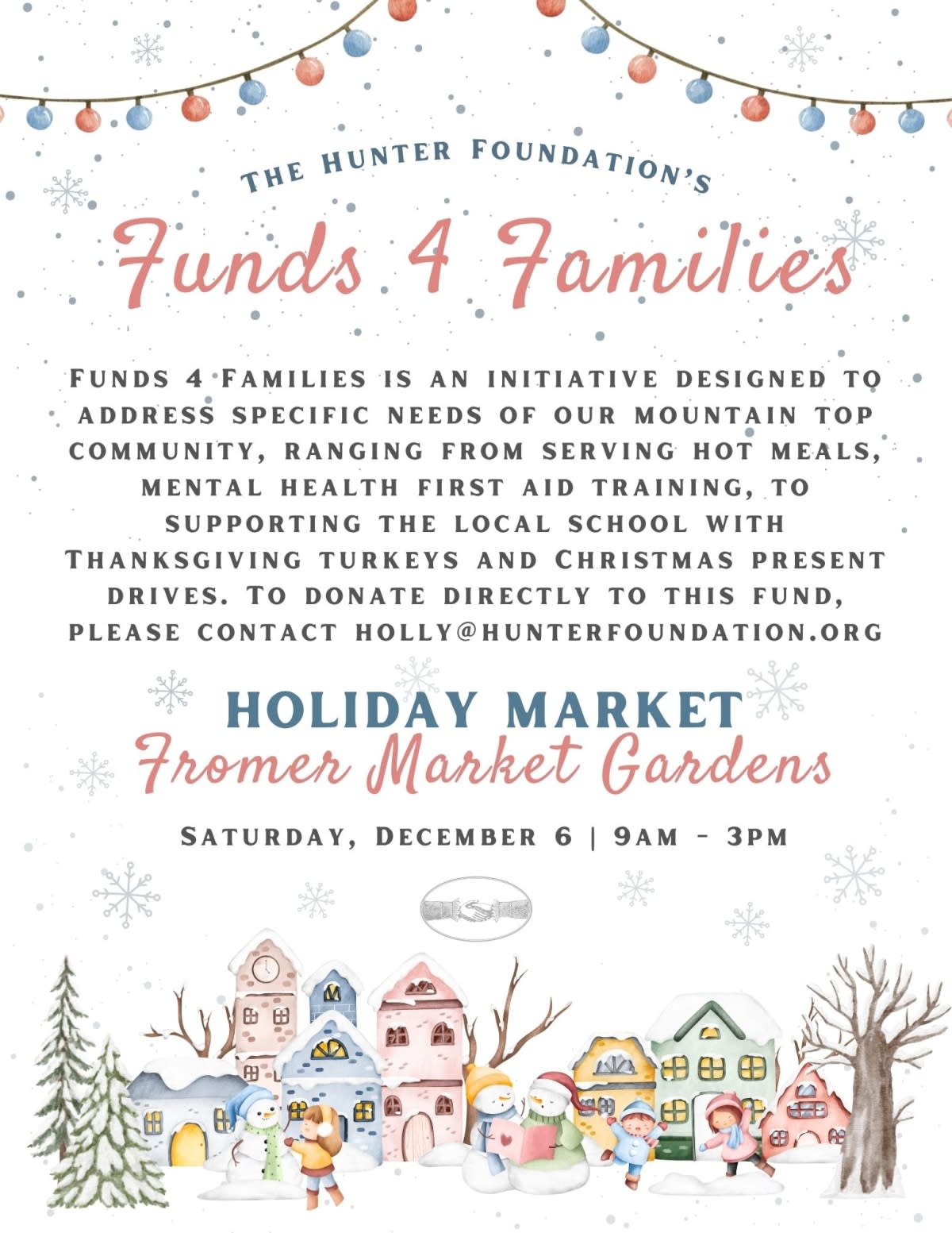 Join Fromer Market Gardens for a very special Holiday Market on Saturday, December 6 from 9am-3pm. The Market will feature over 20 local vendors and artisans for holiday shopping, a basket auction, cookie walk, hot cocoa, beautiful decorations by our friend Rochelle Gracia of Rooted, and of course our own organic veggies. All profits from the event goes to Funds 4 Families, which in turn goes back to the community. Sat, 12/06/2025 at 6120 Main Street, Tannersville, NY 12485Images