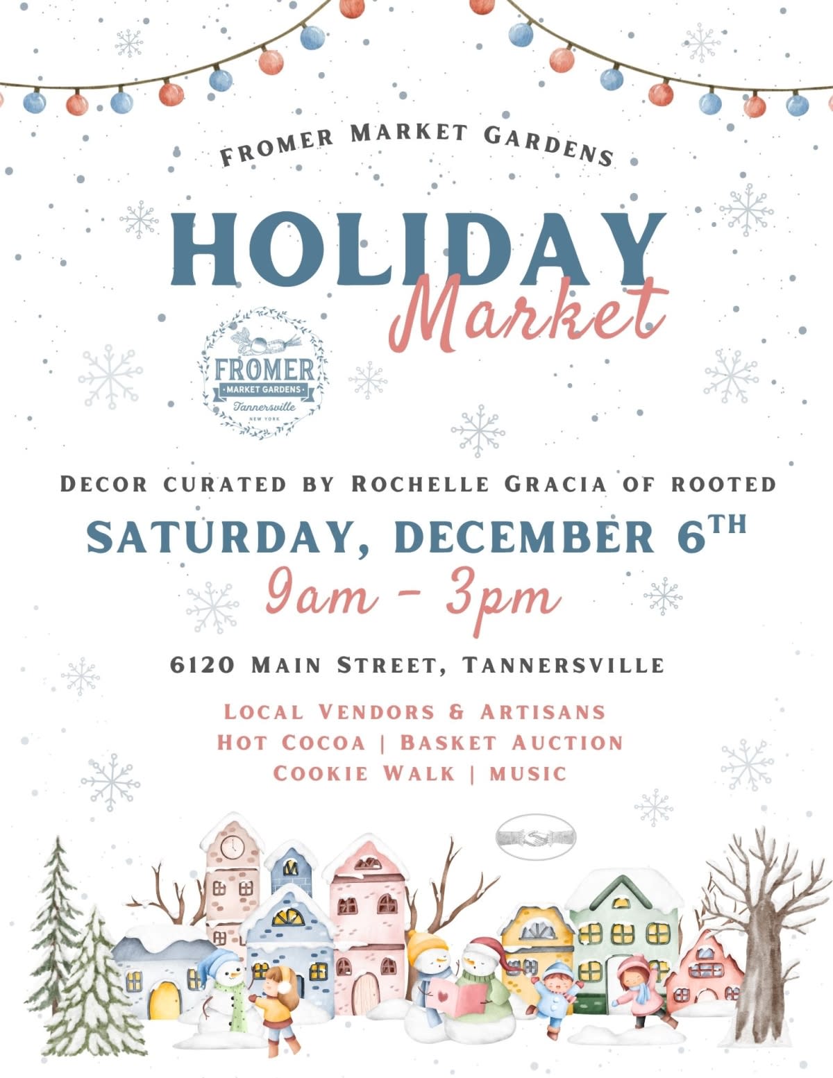 Join Fromer Market Gardens for a very special Holiday Market on Saturday, December 6 from 9am-3pm. The Market will feature over 20 local vendors and artisans for holiday shopping, a basket auction, cookie walk, hot cocoa, beautiful decorations by our friend Rochelle Gracia of Rooted, and of course our own organic veggies. All profits from the event goes to Funds 4 Families, which in turn goes back to the community. Sat, 12/06/2025 at 6120 Main Street, Tannersville, NY 12485Images