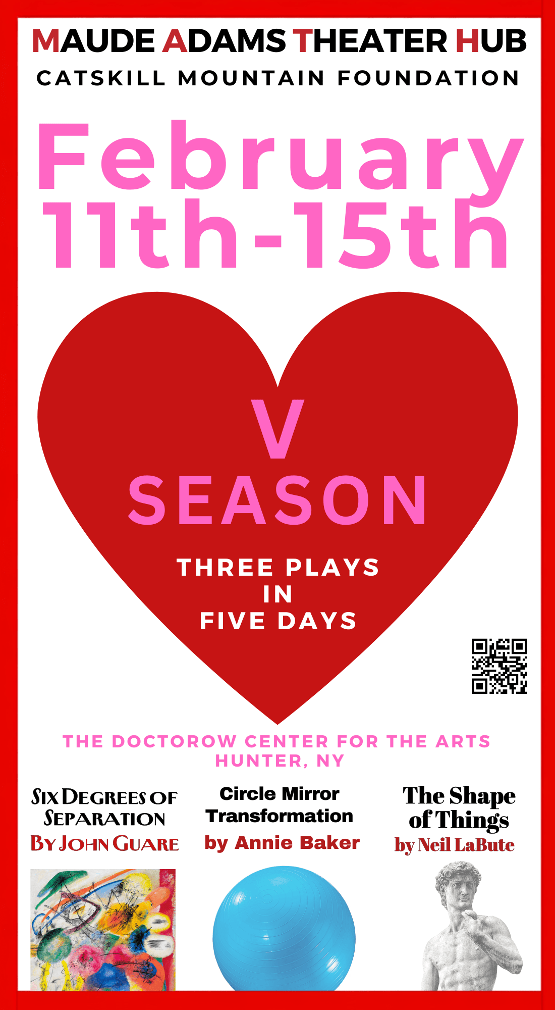 The Maude Adams Theater Hub and The Catskill Mountain Foundation present V Season, a series of five plays over the span of three days. Performance schedule is as follows: Show 1-V Season: The Shape of Things by Neil LaBute Doctorow Center for the Arts, 7971 NY-23A, Hunter, NY A modern twist on Shaw’s Pygmalion, this tale of four college students in pursuit of happiness gets crossed up when one of the four takes things in a surprising direction, tearing the friends apart. Show 2 - V Season: Circle Mirror Transformation by Annie Baker Doctorow Center for the Arts, 7971 NY-23A, Hunter, NY In a remote small town in New Hampshire (or New York), a group of wannabe actors meet once a week to hone their craft and in the process come to terms with their unspoken desires and disappointments. Annie Baker’s quiet meditation on ordinary people will leave audiences moved and transformed. Show 3 - V Season: Six Degrees of Separation by John Guare Doctorow Center for the Arts, 7971 NY-23A, Hunter, NY When Paul, a young man claiming to know their college-aged children shows up at their door, art dealers Ouisa and Flan Kitterage find themselves in the middle of a con game that takes unexpected twists and turns. An exploration of art, identity, and self awareness that rings as true today as it did when it was first written in 1998. Each show has a run time of 90 minutes, with no intermission. Single performance tickets are $20. To purchase a subscription for all three shows for $50, please call the Box Office at (518) 263-2063.Images