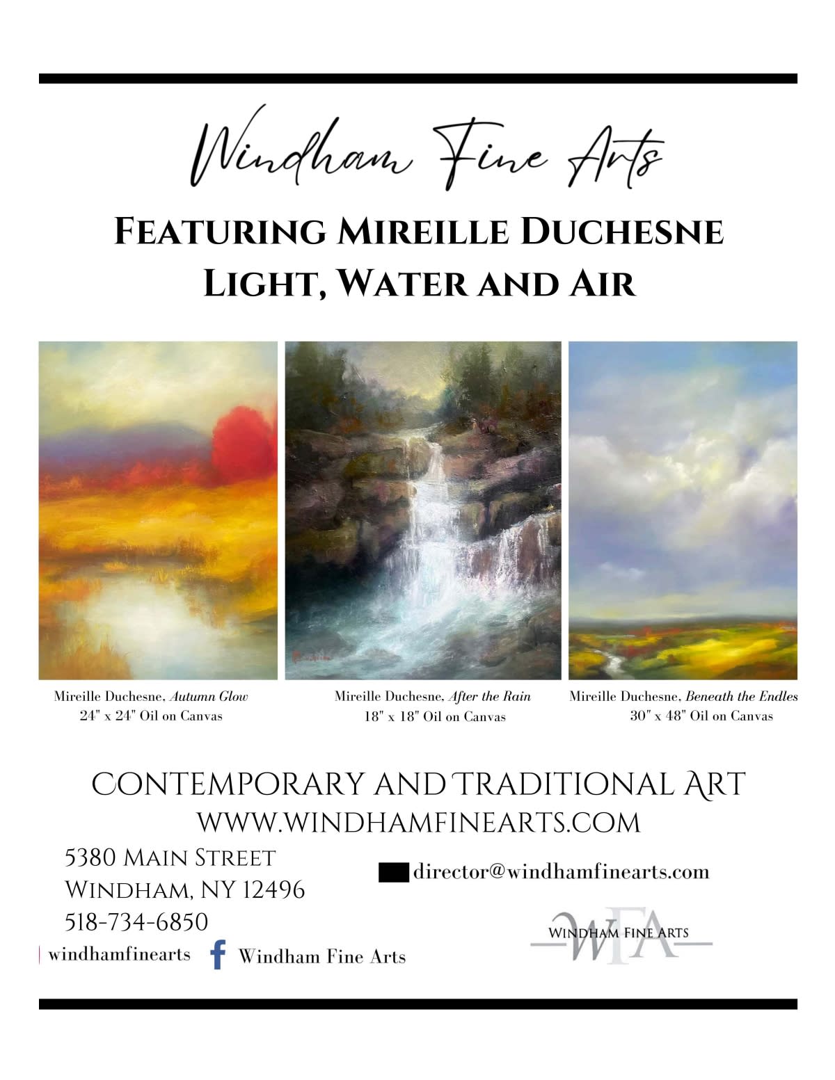 From the hills of Normandy to the heart of the Catskills, acclaimed artist Mireille Duchesne, now featured at Windham Fine Arts. Mireille's art is vibrant, detailed and unforgettable. Her landscapes, rich with spirit and passion, reflect nature and it’s endearing power. Discover her award-winning work at Windham Fine Arts, located at 5380 Main Street in Windham. The gallery is open 12 - 5. For more information contact: director@windhamfinearts.com or visit www.windhamfinearts.com.Images